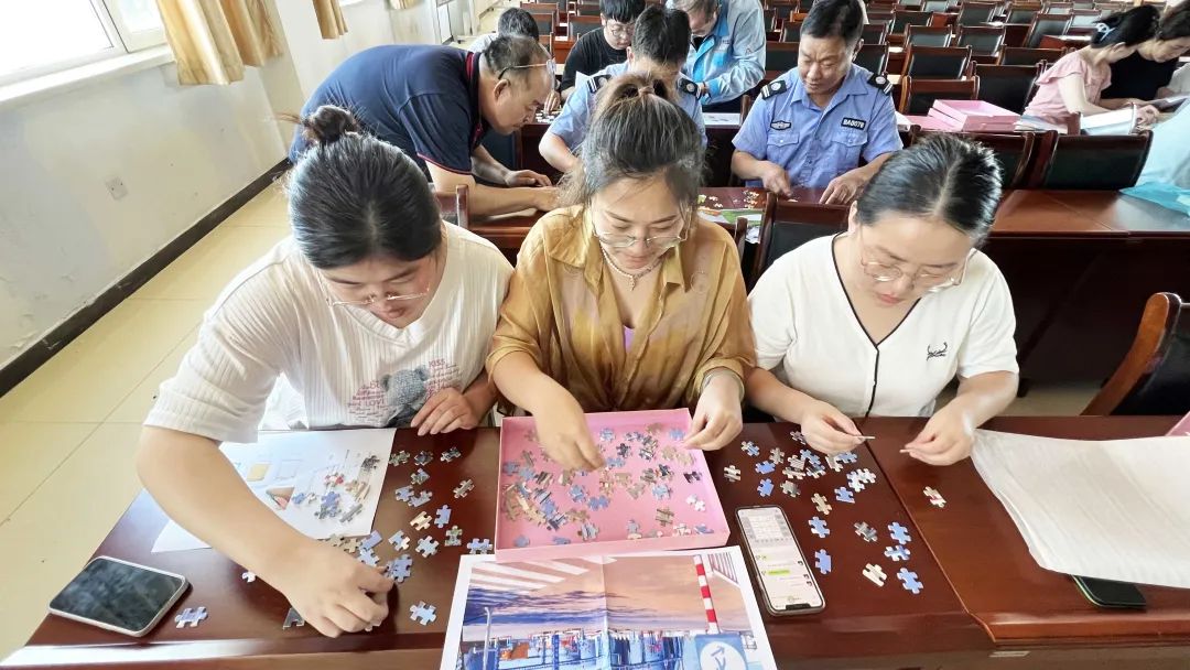 在拼圖比賽中,選手們集中注意力,分工明確,有的先從中間部分開始拼起,有的從四周開始拼起,你一塊我一塊,速度不遑多讓。